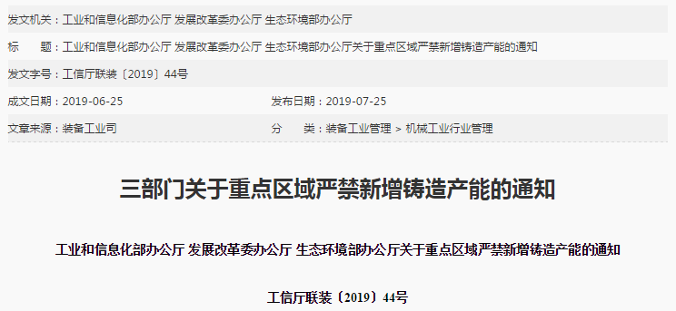 7月25日,工业和信息化部办公厅、发展改革委办公厅、生态环境部办公厅发布了《关于重点区域严禁新增铸造产能的通知》(以下简称“《通知》”)。
